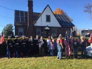 Dedication ceremony of the SUNation Cares donated solar system (from left to right: Marine Honor Guard, Senator Todd Kaminsky, Congressman Lee Zeldin, SUNation CEO Scott Maskin, Eileen Howell and family, Patriot Guard Riders)